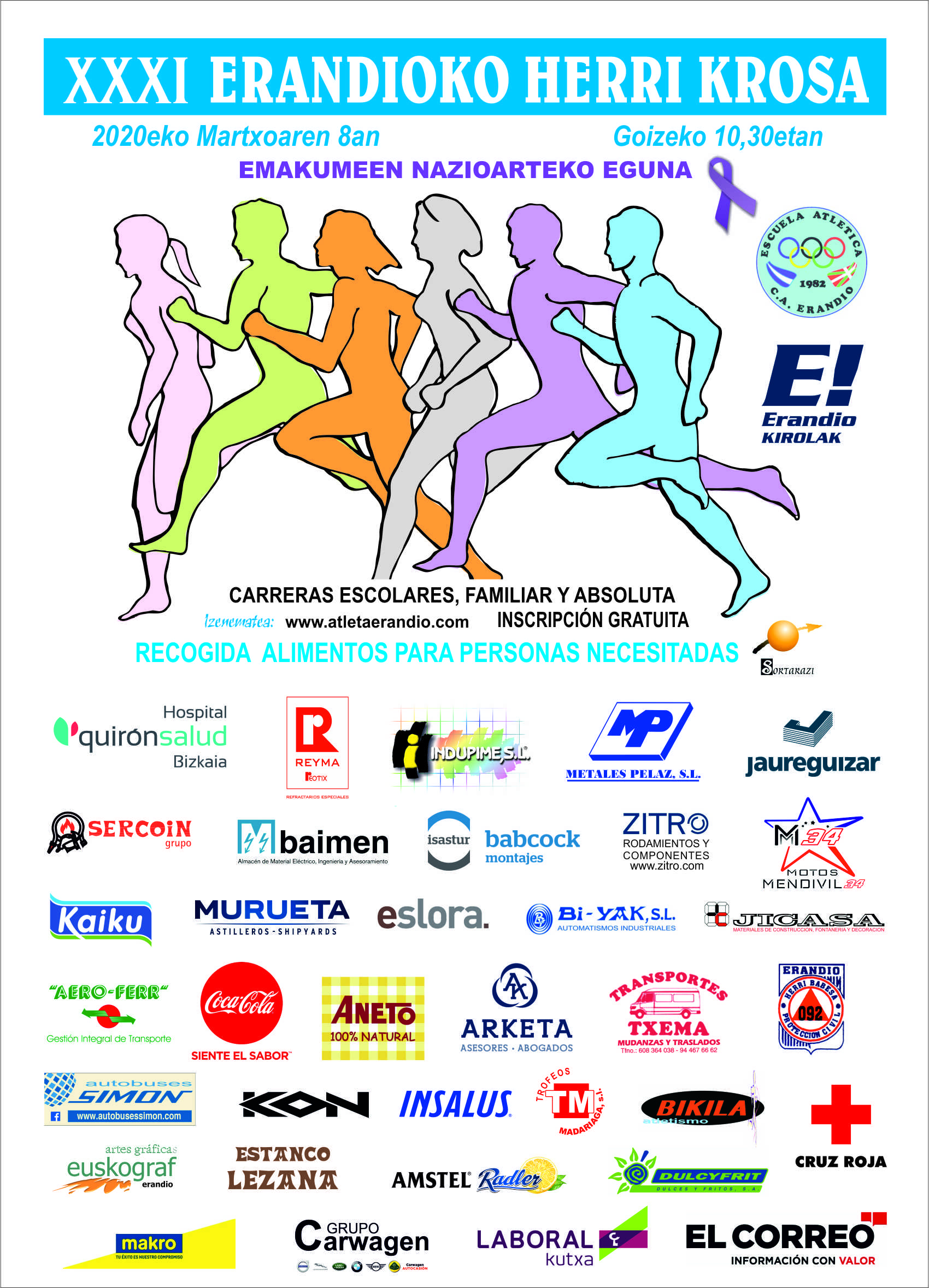 Los años pasan, pero la ilusión por la celebración de esta prueba no decaen en la Escuela Atletica Erandio. Por ello, este año celebraremos la trigésima primera edición de la tradicional Erandioko Herri Krosa. Esta edición será el domingo 8 de Marzo, coincidiendo con el DÍA INTERNACIONAL DE LA MUJER, por lo que hay que marcar en rojo esta fecha en el calendario y reservar ese fin de semana para esta fiesta del atletismo. Al coincidir con una fecha tan señalada la Escuela Atlética Erandio apoyará este día colaborando con la lucha, dedicando unos minutos en la entrega de premios.